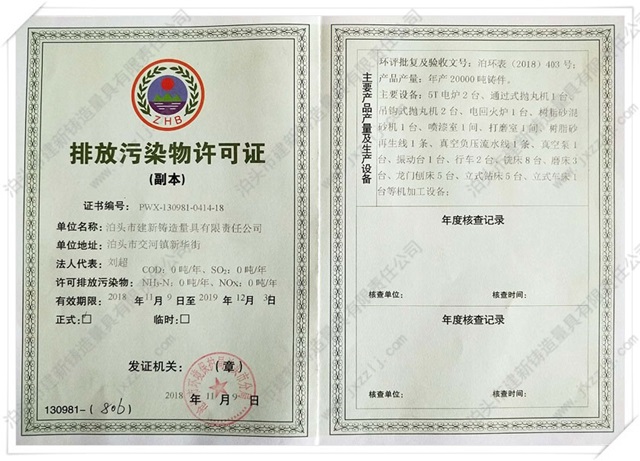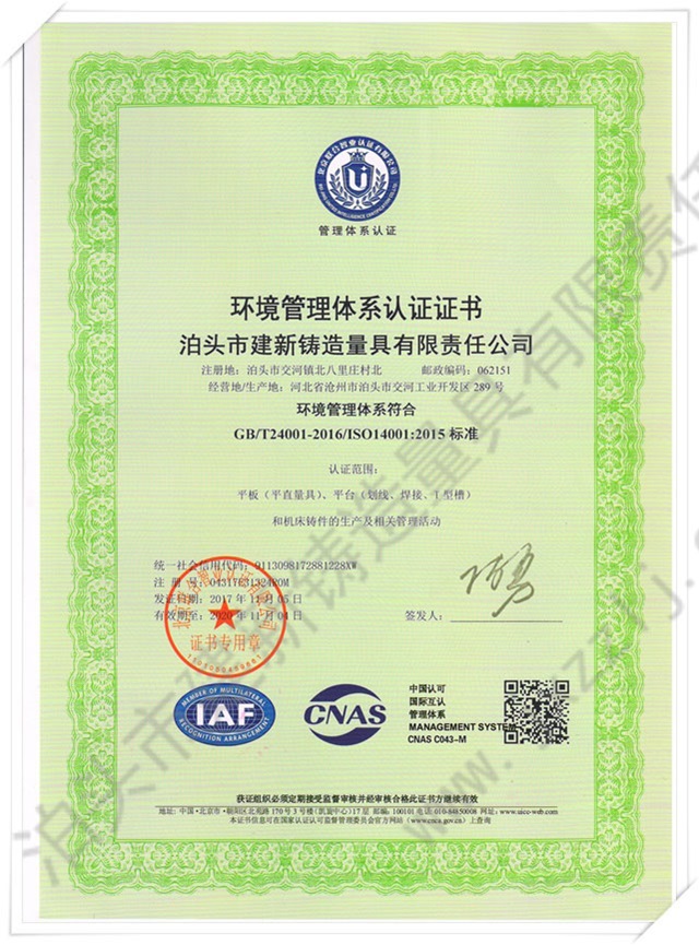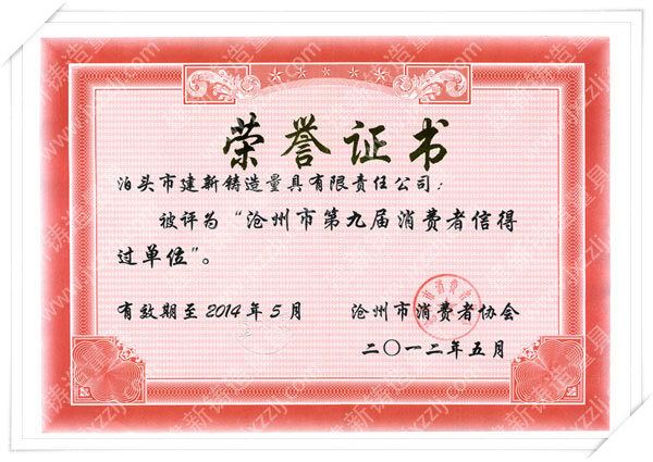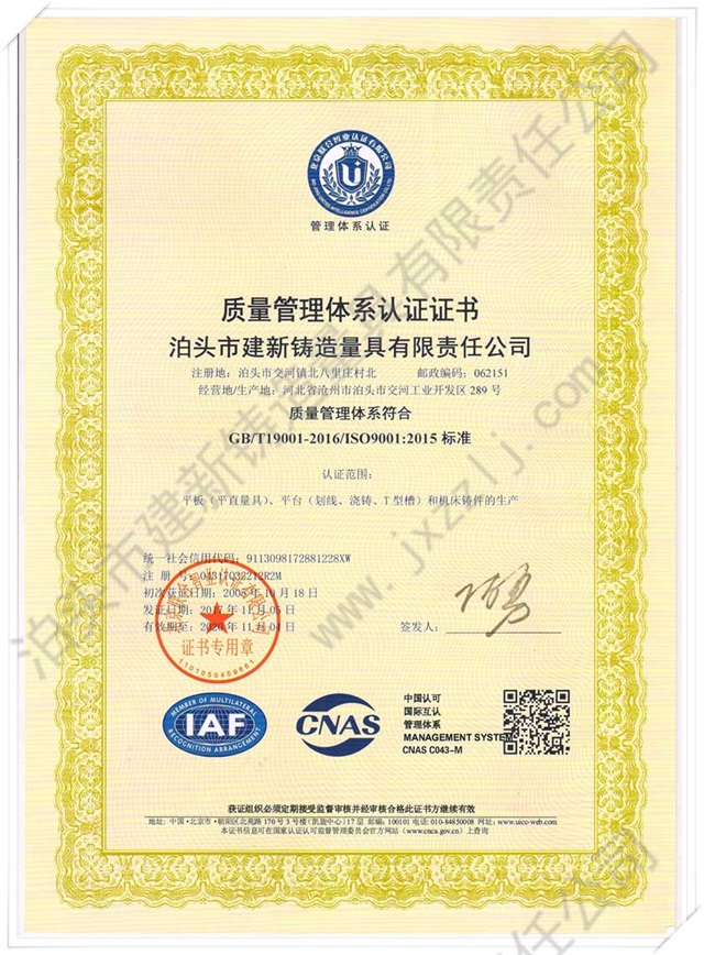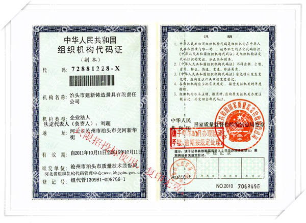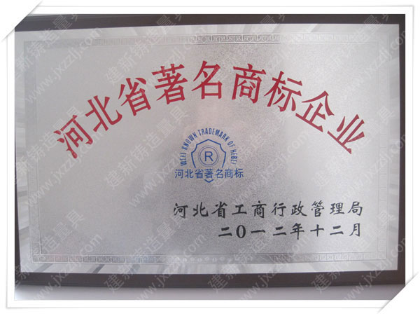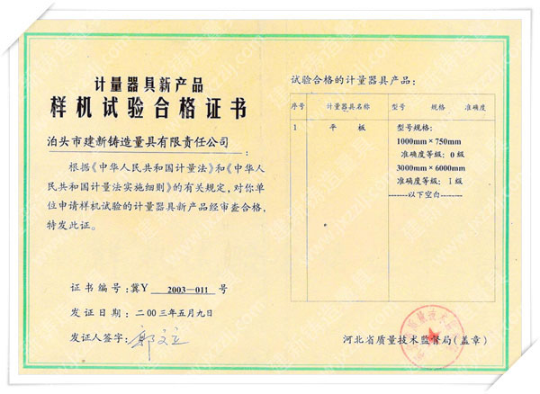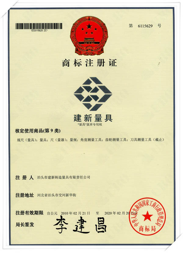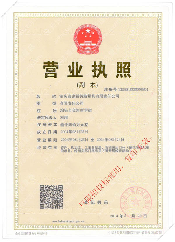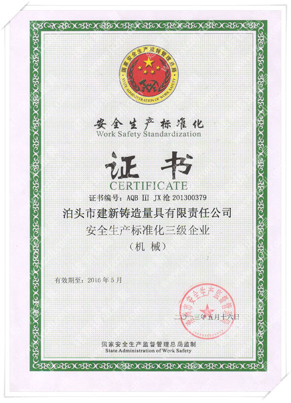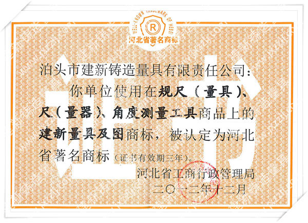 泊头市建新铸造量具有限责任公司是河北省固定资产重点投资项目技术企业。取得“建新量具-商标注册证”“河北省名牌产品”、“河北省著名商标”、中国铸造协会常任理事单位“机械工业质量管理奖”、“沧州市第九届消费者信得过单位”、“中国人民银行机构信用代码证”“、计量器具新产品样机试验合格证书“全国安全生产三级认证企业”等荣誉称号。